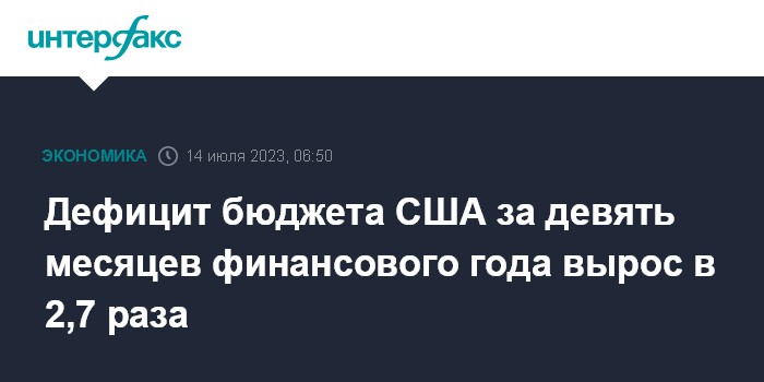 За девять месяцев 2023 финансового года, который начался 1 октября, отрицательное сальдо бюджета США составило $1 трлн 392,64 млрд по сравнению с $515,067 млрд годом ранее.