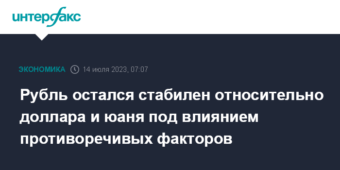 Москва. 14 июля. INTERFAX.RU - Доллар США и юань стабильны на Московской бирже на старте торгов в пятницу, рубль не меняется под влиянием разнонаправленных факторов.