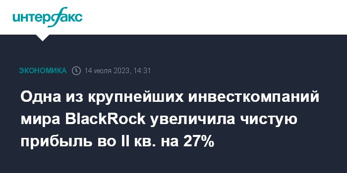 Москва. 14 июля. INTERFAX.RU - BlackRock Inc., одна из крупнейших инвестиционных компаний мира, увеличила чистую прибыль во втором квартале 2023 года на 27%, однако ее выручка снизилась на 1%.