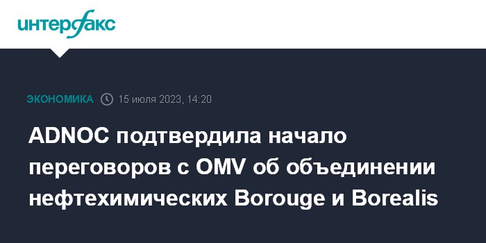 Москва. 15 июля. INTERFAX.RU - Abu Dhabi National Oil Co. (ADNOC) сообщила о вступлении в официальные переговоры с австрийской OMV AG о возможном создании объединенного нефтехимического холдинга посредством слияния компаний Borouge Plc и Borealis AG.