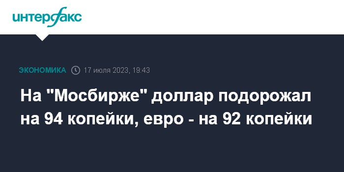 На основе данных "Московской биржи" о средневзвешенных курсах доллара и евро к рублю по сделкам, заключенным с 10:00 до 15:30, ЦБ поднял официальный курс доллара на 18 июля на 30,27 копейки, до 90,4217 рубля/$1, и увеличил курс евро на 45,04 копейки, до 101,6496 рубля.