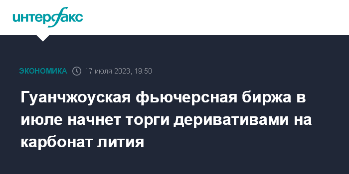 Москва. 17 июля. INTERFAX.RU - Гуанчжоуская фьючерсная биржа (Guangzhou Futures Exchange) получила разрешение Китайского комитета по контролю над ценными бумагами на торговлю фьючерсами на карбонат лития.
