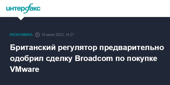 Москва. 19 июля. INTERFAX.RU - Управление по защите конкуренции и рынкам Великобритании (Competition and Markets Authority, CMA) предварительно одобрило сделку по покупке американским производителем полупроводниковых компонентов Broadcom Inc. разработчика технологий в сфере виртуализации и облачной инфраструктуры VMware Inc.