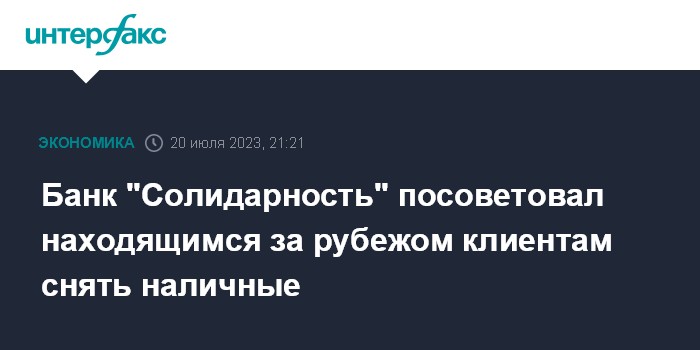 Москва. 20 июля. INTERFAX.RU - Российский банк "Солидарность", активно выпускавший карты Union Pay и попавший под санкции США, рекомендовал клиентам снять наличные и допустил возможные ограничения на проведение операций за границей.