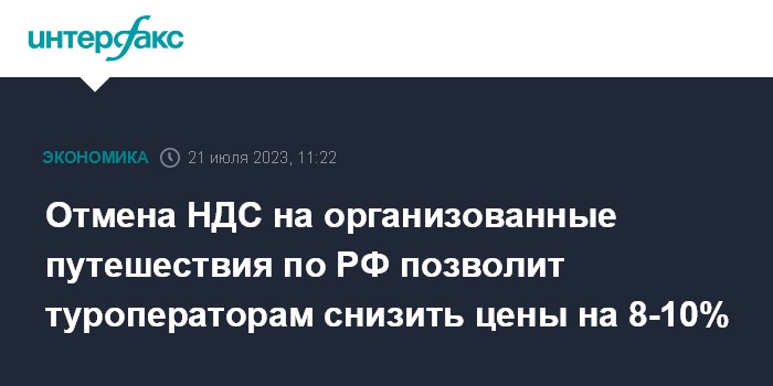 Отмена НДС на организованные путешествия по РФ позволит туроператорам снизить цены на 8-10%