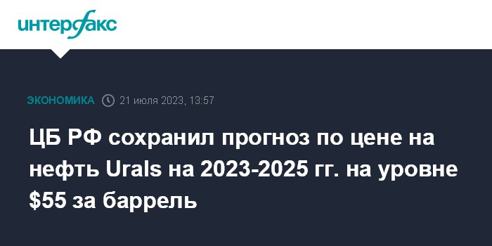 Москва. 21 июля. INTERFAX.RU - ЦБ РФ сохранил прогноз по цене на нефть марки Urals на 2023 год на уровне $55 за баррель, аналогичные ожидания - $55 за баррель. в отношении 2024 и 2025 годов также оставлены без изменений, говорится в опубликованном в пятницу среднесрочном прогнозе Центробанка.