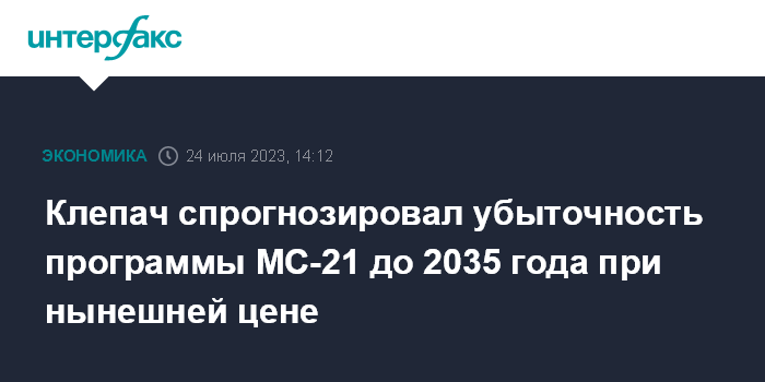 "Все оценки показывают, что высоких доходов здесь (в авиапромышленном секторе - ИФ) не будет. Если брать ту же программу МС-21, при нынешней цене, которая запланирована, там убытки будут до 2035 года. Даже если себестоимость снизим на 30 с лишним процентов", - сказал Клепач.