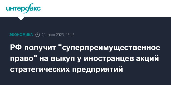 Москва. 24 июля. INTERFAX.RU - Право покупки акций стратегических АО у уходящих с российского рынка иностранцев, которое планируется закрепить за государством, будет "суперпреимущественным", то есть обладать приоритетом над преференциями других лиц. Это следует из проекта президентского указа, которым планируется ввести соответствующую норму.