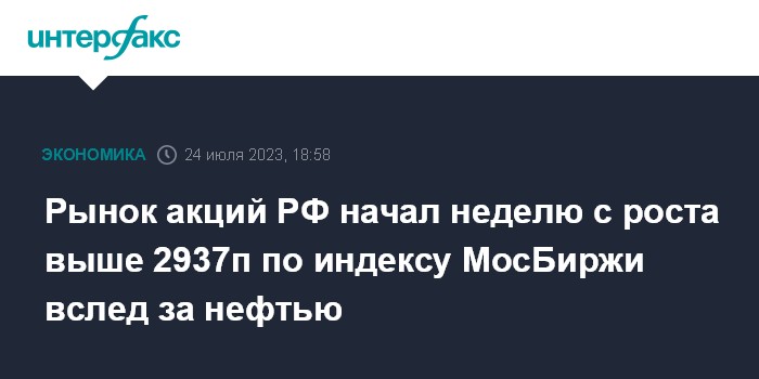 Москва. 24 июля. INTERFAX.RU - Рынок акций РФ начал неделю с роста на фоне подорожавшей нефти (Brent подскочила выше $82,7 за баррель) и позитивных сигналов с фондовых площадок США. Индекс МосБиржи превысил 2937 пунктов, при этом лидерами роста выступили расписки Ozon (+5%) и бумаги "Яндекса" (+4%).