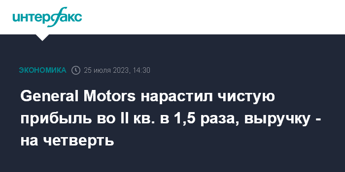 Москва. 25 июля. INTERFAX.RU - Американский автопроизводитель General Motors во втором квартале значительно нарастил чистую прибыль и выручку, а также улучшил прогноз на весь текущий год.