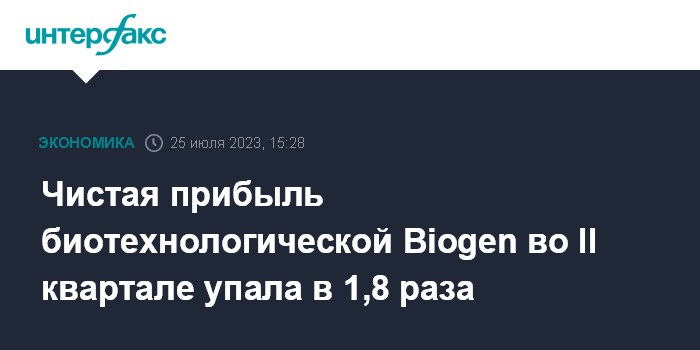 Москва. 25 июля. INTERFAX.RU - Американская биотехнологическая компания Biogen Inc. зафиксировала снижение чистой прибыли во втором квартале 2023 года в 1,8 раза, выручки - на 5%.
