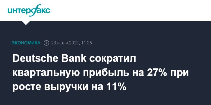 Москва. 26 июля. INTERFAX.RU - Во II квартале 2023 года Deutsche Bank AG, крупнейший банк Германии, снизил чистую прибыль на 27% из-за повышения расходов и резервов на покрытие безнадежных долгов.