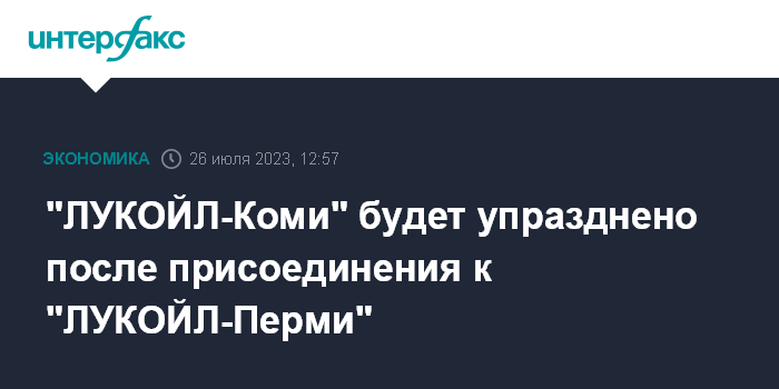 Москва. 26 июля. INTERFAX.RU - ПАО "ЛУКОЙЛ" решило реорганизовать две своих добывающих "дочки" путем присоединения ООО "ЛУКОЙЛ-Коми" к ООО "ЛУКОЙЛ-Пермь".