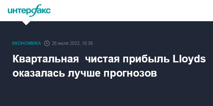 Москва. 26 июля. INTERFAX.RU - Доналоговая прибыль британского банка Lloyds Banking Group Plc во втором квартале 2023 года почти не изменилась, чистая - незначительно увеличилась. Чистая прибыль банка увеличилась до 4,534 млрд фунтов с 4,256 млрд фунтов. Опрошенные банком аналитики в среднем ожидали 4,51 млрд фунтов.