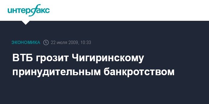 Москва. 22 июля. INTERFAX.RU - Высокий суд Лондона по иску ВТБ 17 июля на неопределенное время продлил срок ареста активов предпринимателя Шалвы Чигиринского, сообщил агентству "Интерфакс" источник, близкий к банку. В случае, если погашение задолженности по этому иску не начнется в ближайшее время, то банк может начать добиваться возбуждения процедуры банкротства Чигиринского как частного лица, сказал он. Вопрос о возбуждении процедуры банкротства предпринимателя может быть рассмотрен ВТБ уже в середине августа.