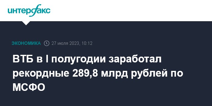 Москва. 27 июля. INTERFAX.RU - ВТБ во втором квартале 2023 года заработал чистую прибыль по МСФО в размере 142,6 млрд рублей, в целом за полугодие - рекордные 289,8 млрд рублей, говорится в сообщении банка.