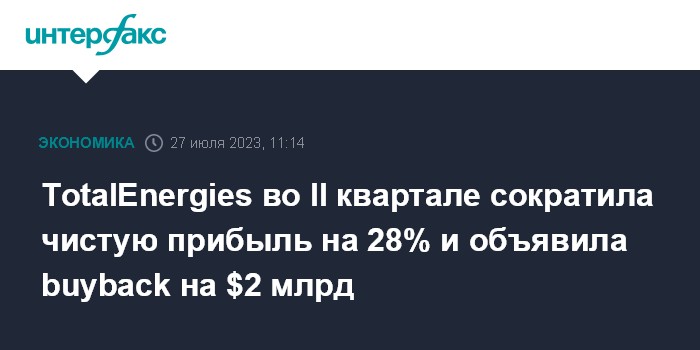 TotalEnergies во II квартале сократила чистую прибыль на 28% и объявила buyback на $2 млрд