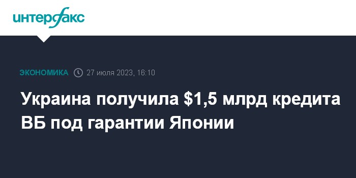Москва. 27 июля. INTERFAX.RU -Государственный бюджет Украины 27 июля получил через механизм Целевого фонда Всемирного банка (ВБ) льготный заем в размере $1,5 млрд под гарантии правительства Японии, сообщил украинский Минфин.