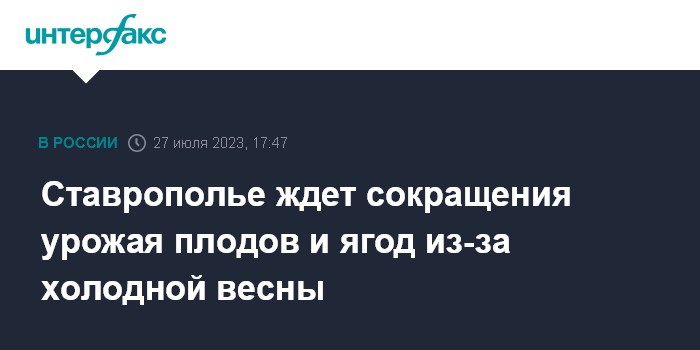 Москва. 27 июля. INTERFAX.RU - В Ставропольском крае ожидают, что урожай плодов и ягод в 2023 году будет меньше прошлогоднего из-за холодной погоды весной, сообщил министр сельского хозяйства региона Сергей Измалков в ходе "прямой линии" в соцсети.