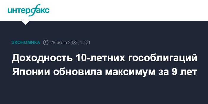 Москва. 28 июля. INTERFAX.RU - Доходность десятилетних государственных облигаций Японии поднялась выше отметки в 0,5% - верхней границы коридора, установленного центробанком страны, - и обновила максимум за девять лет. Доходность 10-летних госбондов поднималась до 0,572% на торгах в пятницу, сообщает Financial Times.