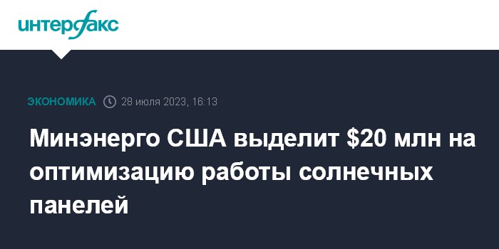 Москва. 28 июля. INTERFAX.RU - Министерство энергетики США выделит $20 млн на оптимизацию жизненного цикла солнечных панелей и сокращение отходов от их использования, сообщает сайт ведомства.