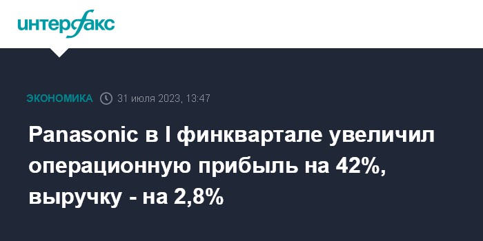 Москва. 31 июля. INTERFAX.RU - Японский производитель бытовой электроники и аккумуляторов для электромобилей Panasonic Corp. по итогам первого квартала 2024 финансового года увеличил операционную прибыль на 41,9% и выручку - на 2,8%, в том числе из-за ослабления курса иены.