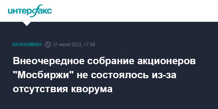Москва. 31 июля. INTERFAX.RU - Внеочередное собрание акционеров "Московской биржи", запланированное на 31 июля, не состоялось из-за отсутствия кворума, сообщила пресс-служба торговой площадки.
