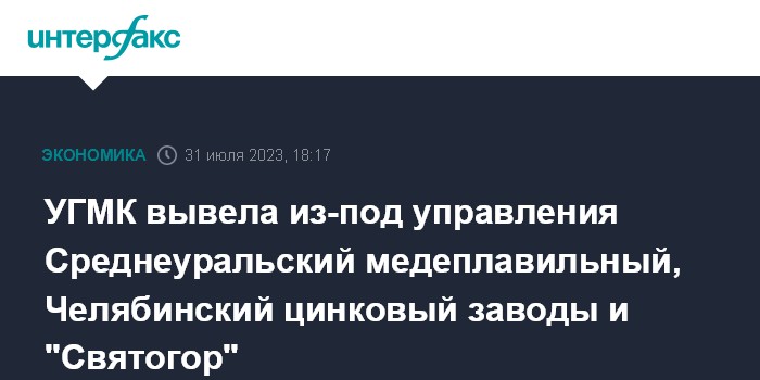 Москва. 31 июля. INTERFAX.RU - Уральская горно-металлургическая компания (УГМК), ранее выполнявшая функции управляющей компании на Челябинском цинковом (ЧЦЗ) и Среднеуральском медеплавильном (СУМЗ) заводах, а также на заводе "Святогор", изменила структуру управления ими, назначив генеральных директоров.