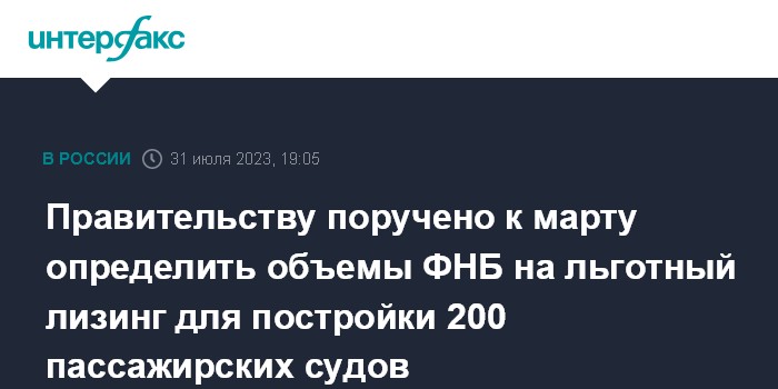 Москва. 31 июля. INTERFAX.RU - Президент РФ Владимир Путин поручил правительству к 1 марта 2024 года принять решение о выделении с 2025 года средств Фонда национального благосостояния (ФНБ) на программу льготного лизинга гражданского судостроения в части дополнительного строительства не менее 200 пассажирских судов.