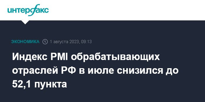Москва. 1 августа. INTERFAX.RU - Индекс PMI обрабатывающих отраслей РФ в июле 2023 года составил 52,1 пункта, опустившись с июньских 52,6 пункта, говорится в материалах исследования S&P Global.