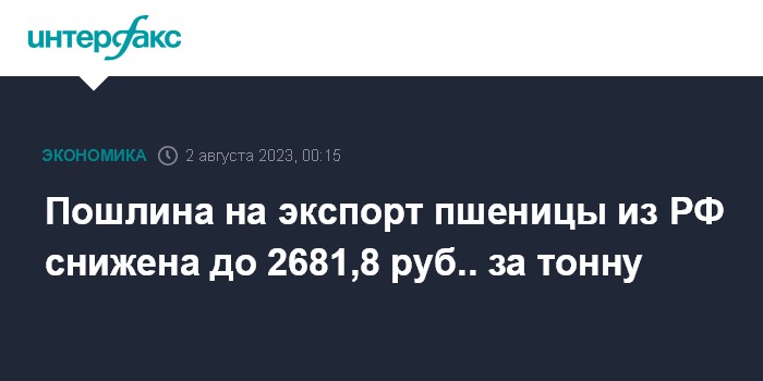 Москва. 2 августа. INTERFAX.RU - Ставка пошлины на экспорт пшеницы из РФ со 2 августа снижена незначительно - до 2681,8 рубля за тонну с 2712,1 рубля неделей ранее, сообщает Минсельхоз.