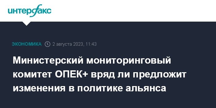 Москва. 2 августа. INTERFAX.RU - Министры мониторингового комитета ОПЕК+ (JMMC) в ходе предстоящего заседания 4 августа вряд ли примут рекомендации об изменении квот по добыче, считают несколько опрошенных "Интерфаксом" участников альянса, пожелавшие остаться неназванными.