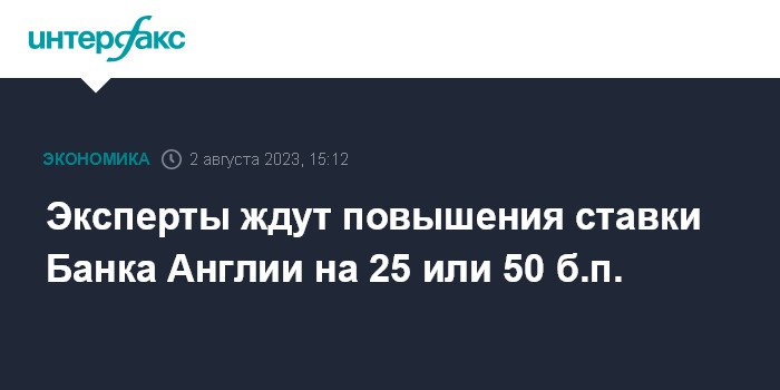 Москва. 2 августа. INTERFAX.RU - Банк Англии по итогам заседания 3 августа повысит ключевую процентную ставку на 25 базисных пунктов - до 5,25% годовых, полагает большинство аналитиков и экономистов. При этом эксперты не исключают и вероятности подъема ставки на 50 б.п. по итогам второго заседания подряд, пишет Financial Times.