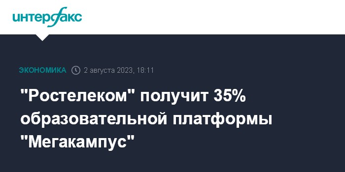 Москва. 2 августа. INTERFAX.RU - ПАО "Ростелеком" инвестирует в ООО "Мегакампус" (развивает одноименную образовательную P2P-платформу) и в результате получит 35% долей компании, сообщил оператор связи.