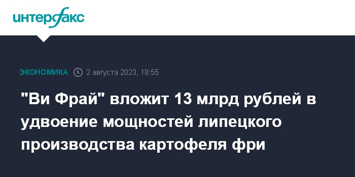 "Ви Фрай" вложит 13 млрд рублей в удвоение мощностей липецкого производства картофеля фри