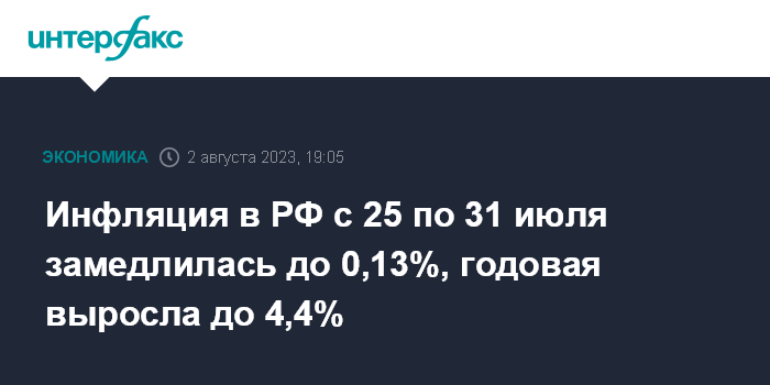 Инфляция в РФ с 25 по 31 июля замедлилась до 0,13%, годовая выросла до 4,4%