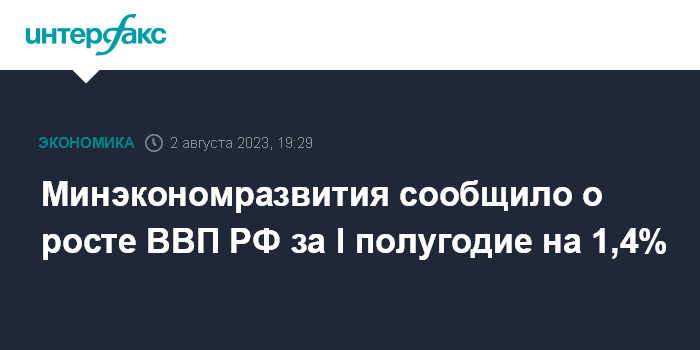 Москва. 2 августа. INTERFAX.RU - Российская экономика в I полугодии 2023 года, по оценке Минэкономразвития, выросла на 1,4% по сравнению с январем-июнем 2022 года. Об этом говорится в обзоре "О текущей ситуации в экономике".