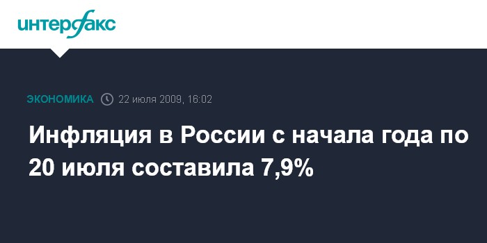 Москва. 22 июля. INTERFAX.RU - За период с 14 по 20 июля 2009 года инфляция в России составила 0,1%, с начала месяца - 0,4%, с начала года - 7,9%. Такие данные приводит Федеральная служба госстатистики (Росстат). Для сравнения в 2008 году потребительские цены с начала месяца выросли на 0,5%, с начала года на 9,3%. В целом за июль 2008 года индекс потребительских цен составил 100,5%.