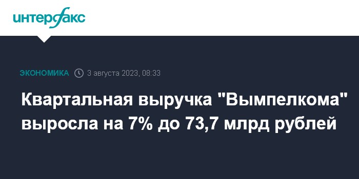 Москва. 3 августа. INTERFAX.RU - Во II квартале 2023 года выручка ПАО "Вымпелком" всоставила 73,7 млрд рублей, что на 7% больше, чем годом ранее, сообщил холдинг VEON, которому принадлежит оператор.