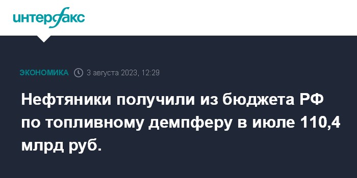 Москва. 3 августа. INTERFAX.RU - Выплаты из российского бюджета нефтяным компаниям по топливному демпферу в июле 2023 года составили 110,4 млрд рублей, тогда как в июне они равнялись 78,6 млрд рублей, сообщается в материалах о формировании и использовании дополнительных нефтегазовых доходов федерального бюджета, размещенных на сайте Минфина.