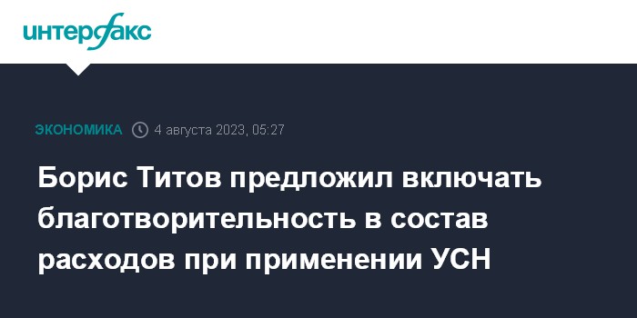Москва. 4 августа. INTERFAX.RU - Уполномоченный при президенте России по защите прав предпринимателей Борис Титов обратился в Минфин с предложением рассмотреть возможность включения благотворительной помощи в состав расходов при применении упрощенной системы налогообложения (УСН) по базе "доходы минус расходы".