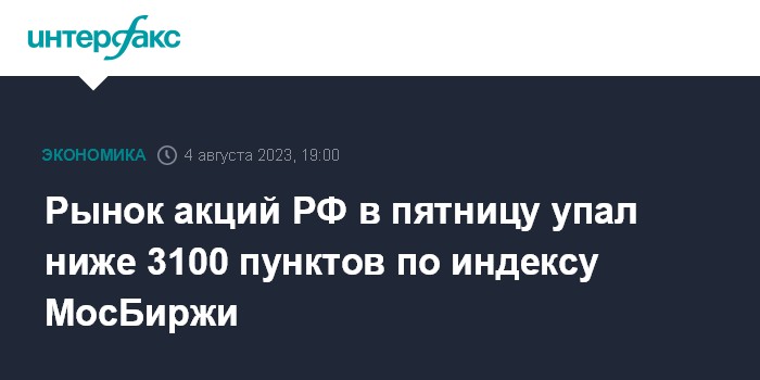 Москва. 4 августа. INTERFAX.RU - Рынок акций РФ в пятницу скорректировался вниз в рамках фиксации прибыли игроками после недельного ралли, хотя настроения на внешних площадках улучшились. Индекс МосБиржи после утреннего роста в район 3195 пунктов (новый максимум с февраля 2022 года) откатился ниже 3100 пунктов, лидерами снижения выступили бумаги "РусГидро".