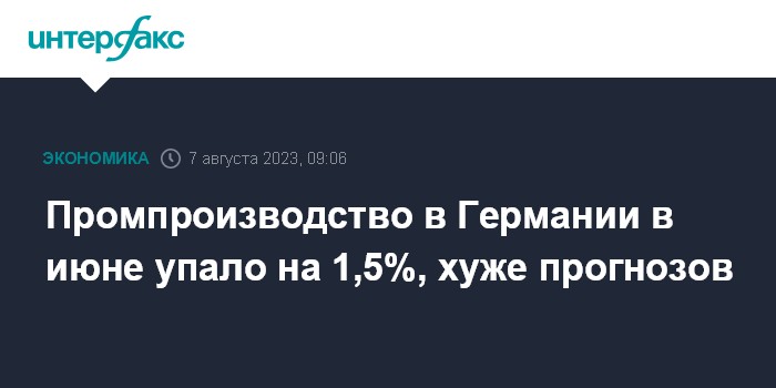 Москва. 7 августа. INTERFAX.RU - Объем промышленного производства в ФРГ в июне сократился на 1,5% по сравнению с предыдущим месяцем, сообщило Федеральное статистическое управление страны (Destatis).