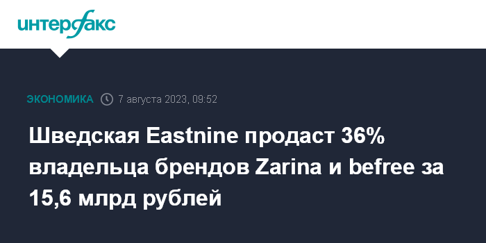 Шведская Eastnine продаст 36% владельца брендов Zarina и befree за 15,6 млрд рублей