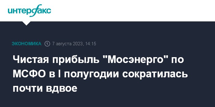 Москва. 7 августа. INTERFAX.RU - Чистая прибыль ПАО "Мосэнерго" по МСФО в I полугодии 2023 г. сократилась на 44,1% по сравнению с аналогичным периодом прошлого года, до 6,88 млрд руб.