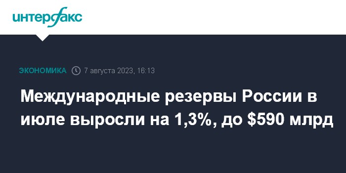 Москва. 7 августа. INTERFAX.RU - В июле 2023 года объем международных (золотовалютных) резервов России увеличился на $7,548 млрд, или на 1,3%, до $589,966 млрд с $582,418 млрд, следует из информации на сайте Банка России.