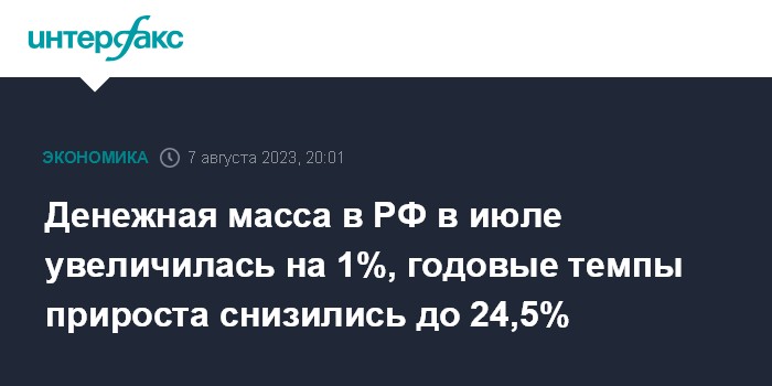 Денежная масса в РФ в июле увеличилась на 1%, годовые темпы прироста снизились до 24,5%
