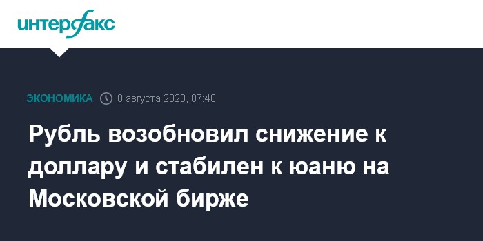 Москва. 8 августа. INTERFAX.RU - Доллар США растет, юань почти стабилен на Московской бирже на старте торгов во вторник, рубль после кратковременного укрепления в рамках коррекции вернулся к падению под давлением негативных факторов, в том числе дисбаланса между спросом предложением иностранной валюты.