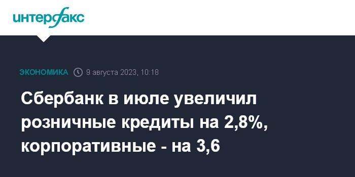 Корпоративный кредитный портфель вырос до 21,6 трлн рублей, показав рост на 3,6% в июле (+2,7% без учета валютной переоценки). С начала года портфель увеличился на 15% (+9,3% без учета валютной переоценки). За месяц корпоративным клиентам был выдан объем кредитов на сумму более 2 трлн рублей.