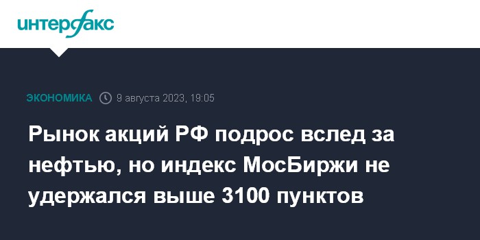Москва. 9 августа. INTERFAX.RU - Рынок акций РФ в среду подрос на фоне подорожавшей нефти (цена Brent поднялась к $87 за баррель) и смешанных сигналов с внешних фондовых площадок. Индекс МосБиржи протестировал рубеж 3100 пунктов, но удержать его не смог из-за вечернего укрепления рубля на новостях от ЦБ РФ об отказе от покупок валюты на внутреннем рынке до конца 2023 года. Во "втором эшелоне" продолжили ралли бумаги региональных энергетических компаний.